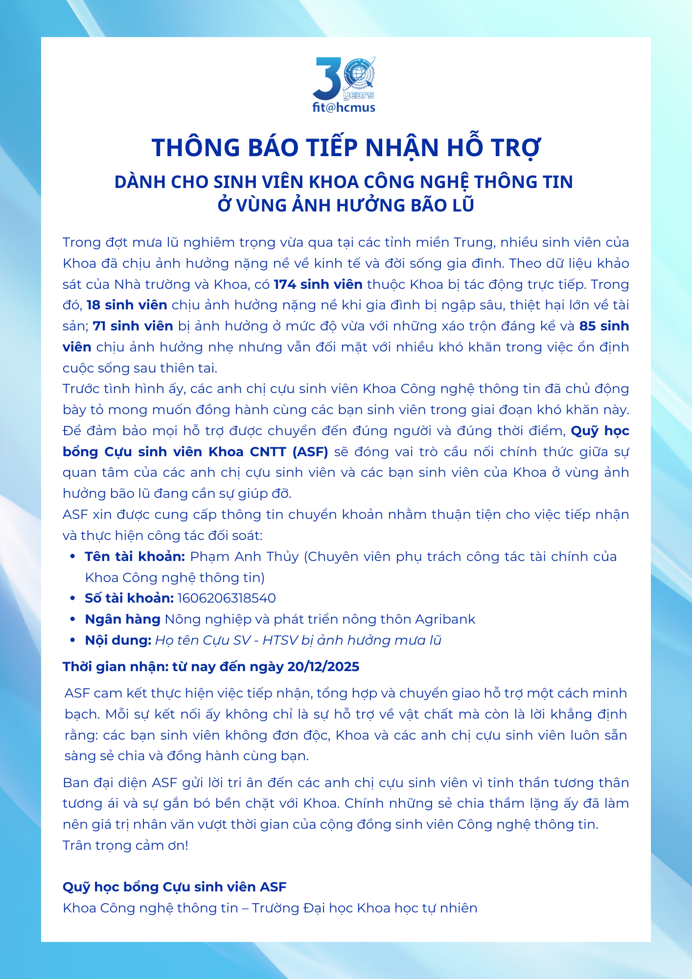 [Quỹ học bổng Cựu sinh viên ASF] Thông báo tiếp nhận hỗ trợ dành cho sinh viên CNTT ảnh hưởng bởi bão lũ