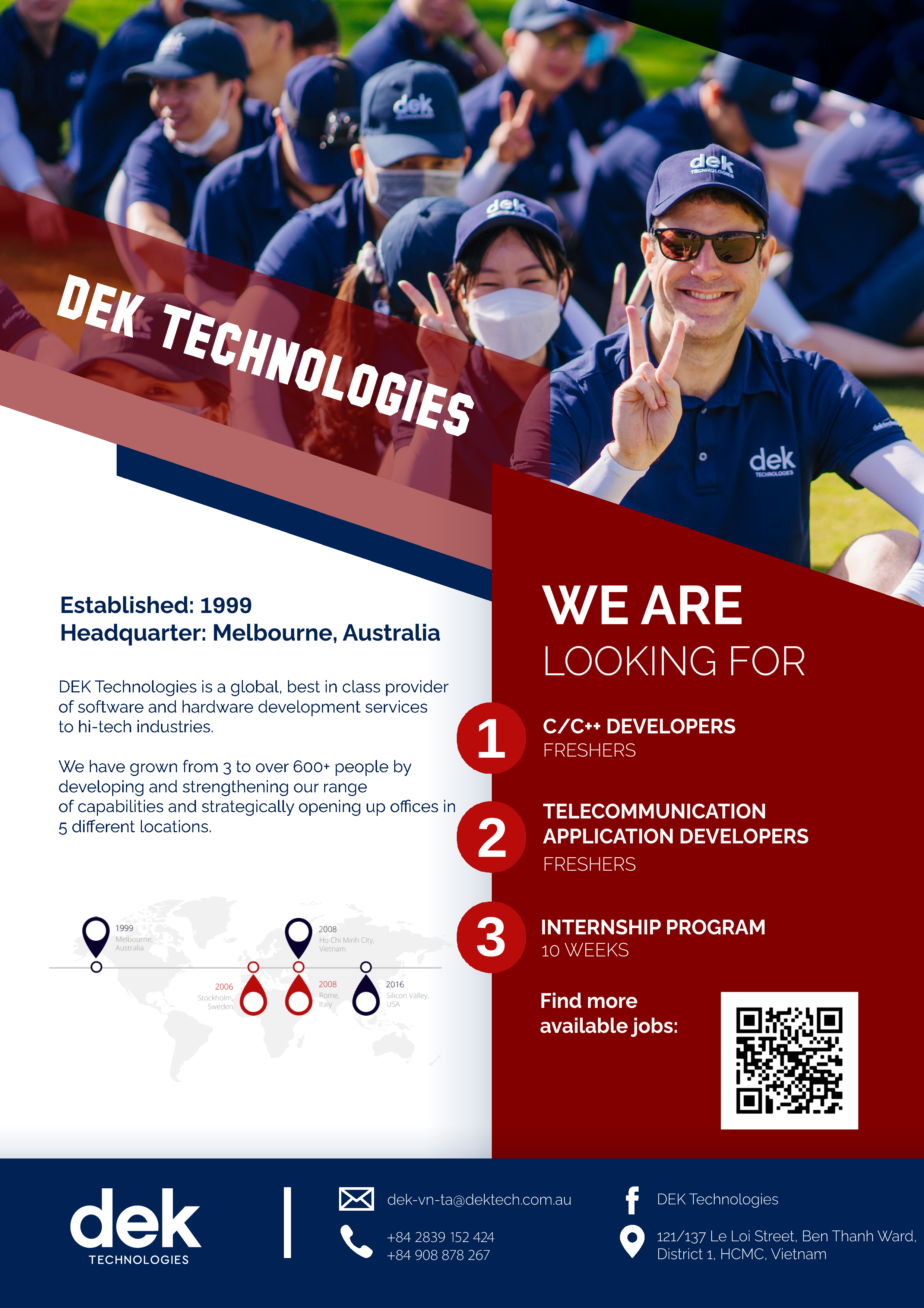 DEK Technologies là Công ty Phần mềm đa quốc gia của Úc có hơn 20 năm kinh nghiệm làm về các dự án System Software, Embedded và Web development với khách hàng chủ yếu đến từ Châu Âu và Mỹ. Hiện DEK Technologies có hơn 800 thành viên với 5 Văn phòng đặt tại Úc, Ý, Thụy Điển, Mỹ và Việt Nam.