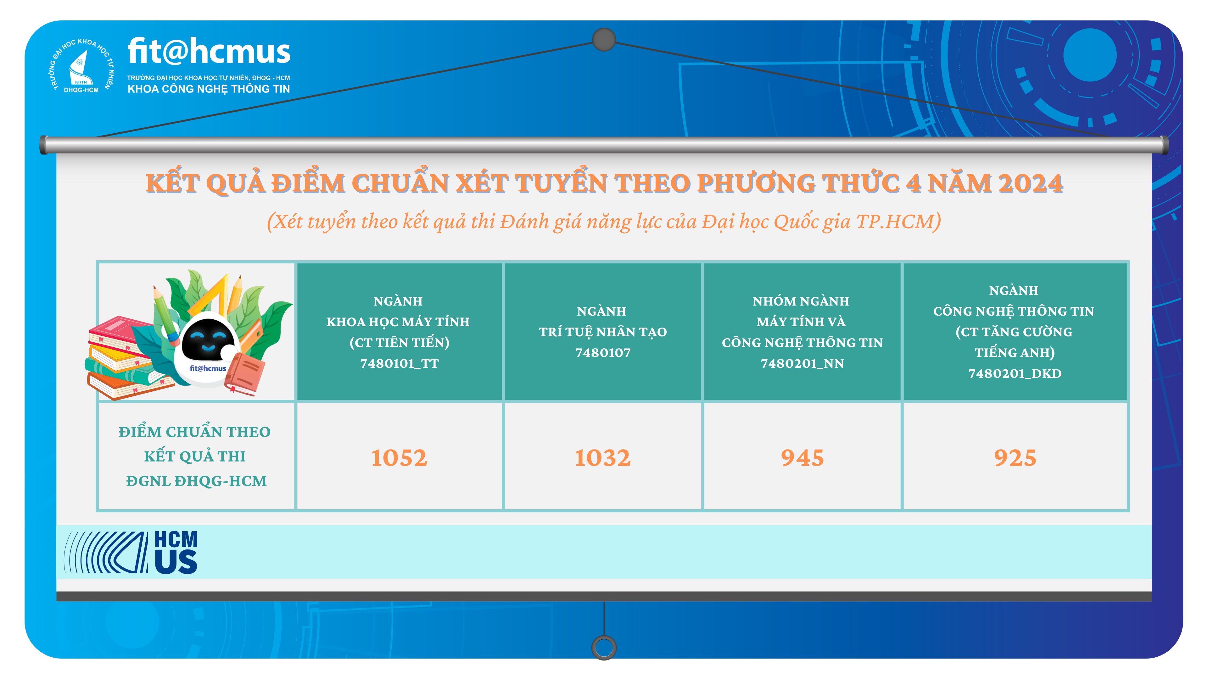 Hội đồng tuyển sinh Trường Đại học Khoa học tự nhiên, ĐHQG-HCM (sau đây gọi tắt là Trường ĐH KHTN hoặc Trường) thông báo đến thí sinh đã nộp hồ sơ xét tuyển cho Trường về điểm chuẩn trúng tuyển diện xét tuyển đại học hệ chính quy dựa trên kết quả kỳ thi đánh giá năng lực do ĐHQG-HCM tổ chức năm 2024 - Phương thức xét tuyển 4.