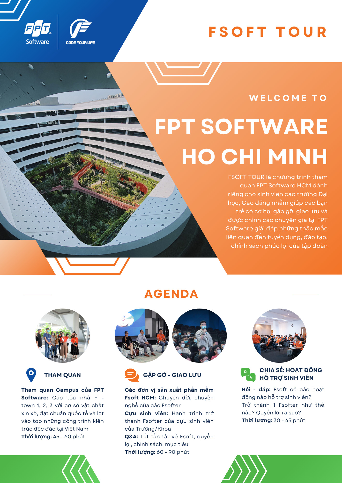 FSOFT TOUR là chương trình tham quan FPT Software HCM dành riêng cho sinh viên các trường ĐH, CĐ nhằm giúp các bạn trẻ có cơ hội gặp gỡ, giao lưu và được chính các chuyên gia tại FPT Software giải đáp những thắc mắc liên quan đến tuyển dụng, đào tạo, chính sách phúc lợi của tập đoàn.