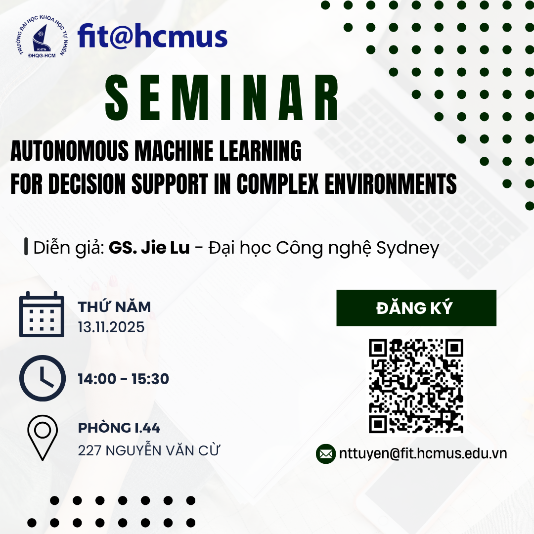 FIT.HCMUS thân mời Quý Thầy Cô, Nghiên cứu sinh, Học viên Cao học và các bạn Sinh viên tham gia Seminar với tựa đề “Autonomous Machine Learning for Decision Support in Complex Environments” do GS. Jie Lu AO – Giám đốc Viện Trí tuệ Nhân tạo Úc, Đại học Công nghệ Sydney – trình bày với thông tin như sau: